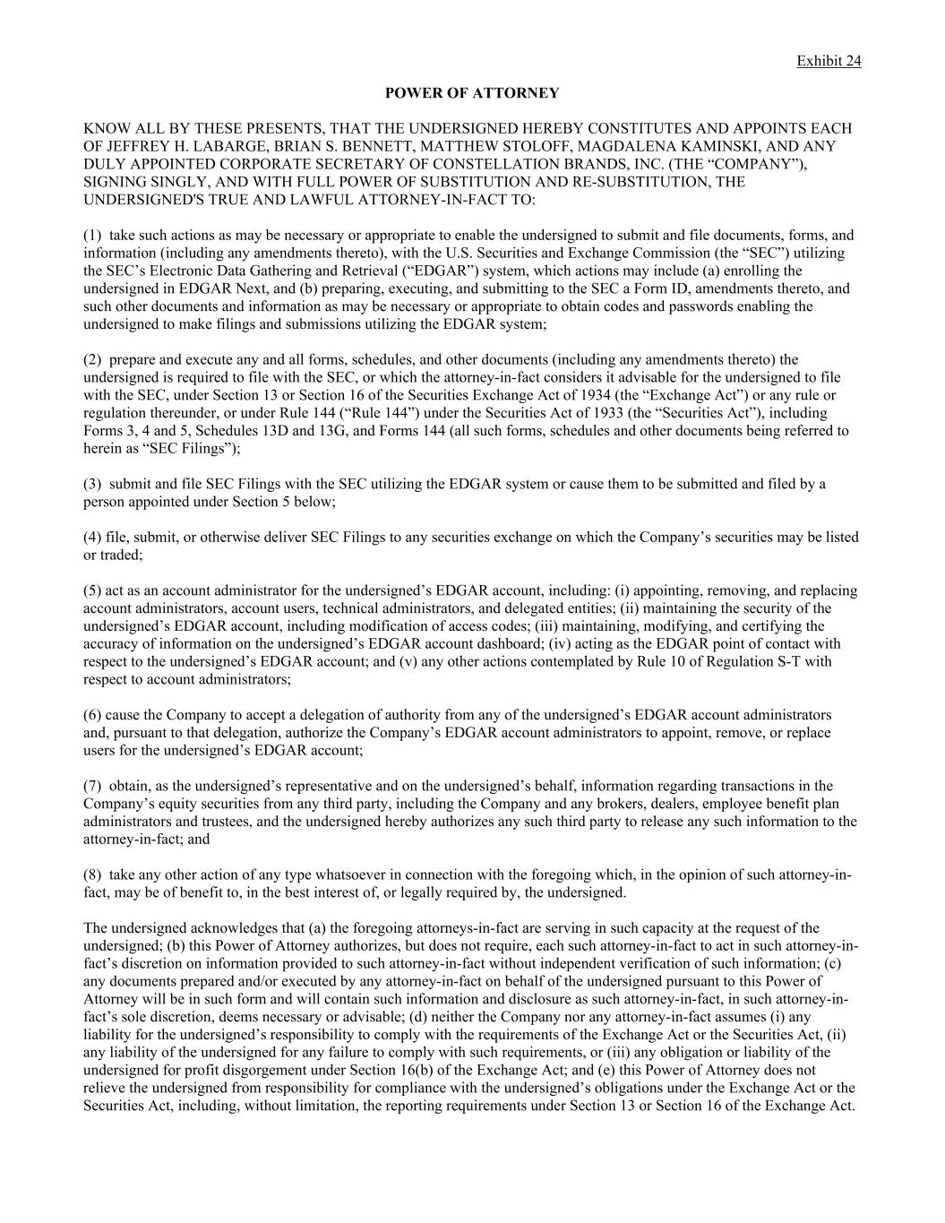 Exhibit 24 POWER OF ATTORNEY KNOW ALL BY THESE PRESENTS, THAT THE UNDERSIGNED HEREBY CONSTITUTES AND APPOINTS EACH OF JEFFREY H. LABARGE, BRIAN S. BENNETT, MATTHEW STOLOFF, MAGDALENA KAMINSKI, AND ANY DULY APPOINTED CORPORATE SECRETARY OF CONSTELLATION BRANDS, INC. (THE “COMPANY”), SIGNING SINGLY, AND WITH FULL POWER OF SUBSTITUTION AND RE-SUBSTITUTION, THE UNDERSIGNED'S TRUE AND LAWFUL ATTORNEY-IN-FACT TO: (1) take such actions as may be necessary or appropriate to enable the undersigned to submit and file documents, forms, and information (including any amendments thereto), with the U.S. Securities and Exchange Commission (the “SEC”) utilizing the SEC’s Electronic Data Gathering and Retrieval (“EDGAR”) system, which actions may include (a) enrolling the undersigned in EDGAR Next, and (b) preparing, executing, and submitting to the SEC a Form ID, amendments thereto, and such other documents and information as may be necessary or appropriate to obtain codes and passwords enabling the undersigned to make filings and submissions utilizing the EDGAR system; (2) prepare and execute any and all forms, schedules, and other documents (including any amendments thereto) the undersigned is required to file with the SEC, or which the attorney-in-fact considers it advisable for the undersigned to file with the SEC, under Section 13 or Section 16 of the Securities Exchange Act of 1934 (the “Exchange Act”) or any rule or regulation thereunder, or under Rule 144 (“Rule 144”) under the Securities Act of 1933 (the “Securities Act”), including Forms 3, 4 and 5, Schedules 13D and 13G, and Forms 144 (all such forms, schedules and other documents being referred to herein as “SEC Filings”); (3) submit and file SEC Filings with the SEC utilizing the EDGAR system or cause them to be submitted and filed by a person appointed under Section 5 below; (4) file, submit, or otherwise deliver SEC Filings to any securities exchange on which the Company’s securities may be listed or traded; (5) act as an account administrator for the undersigned’s EDGAR account, including: (i) appointing, removing, and replacing account administrators, account users, technical administrators, and delegated entities; (ii) maintaining the security of the undersigned’s EDGAR account, including modification of access codes; (iii) maintaining, modifying, and certifying the accuracy of information on the undersigned’s EDGAR account dashboard; (iv) acting as the EDGAR point of contact with respect to the undersigned’s EDGAR account; and (v) any other actions contemplated by Rule 10 of Regulation S-T with respect to account administrators; (6) cause the Company to accept a delegation of authority from any of the undersigned’s EDGAR account administrators and, pursuant to that delegation, authorize the Company’s EDGAR account administrators to appoint, remove, or replace users for the undersigned’s EDGAR account; (7) obtain, as the undersigned’s representative and on the undersigned’s behalf, information regarding transactions in the Company’s equity securities from any third party, including the Company and any brokers, dealers, employee benefit plan administrators and trustees, and the undersigned hereby authorizes any such third party to release any such information to the attorney-in-fact; and (8) take any other action of any type whatsoever in connection with the foregoing which, in the opinion of such attorney-in- fact, may be of benefit to, in the best interest of, or legally required by, the undersigned. The undersigned acknowledges that (a) the foregoing attorneys-in-fact are serving in such capacity at the request of the undersigned; (b) this Power of Attorney authorizes, but does not require, each such attorney-in-fact to act in such attorney-in- fact’s discretion on information provided to such attorney-in-fact without independent verification of such information; (c) any documents prepared and/or executed by any attorney-in-fact on behalf of the undersigned pursuant to this Power of Attorney will be in such form and will contain such information and disclosure as such attorney-in-fact, in such attorney-in- fact’s sole discretion, deems necessary or advisable; (d) neither the Company nor any attorney-in-fact assumes (i) any liability for the undersigned’s responsibility to comply with the requirements of the Exchange Act or the Securities Act, (ii) any liability of the undersigned for any failure to comply with such requirements, or (iii) any obligation or liability of the undersigned for profit disgorgement under Section 16(b) of the Exchange Act; and (e) this Power of Attorney does not relieve the undersigned from responsibility for compliance with the undersigned’s obligations under the Exchange Act or the Securities Act, including, without limitation, the reporting requirements under Section 13 or Section 16 of the Exchange Act.