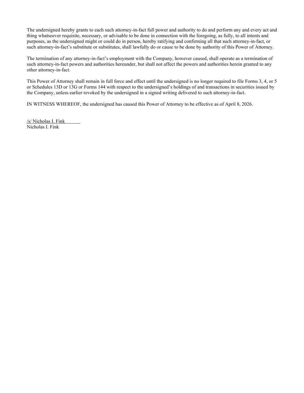 The undersigned hereby grants to each such attorney-in-fact full power and authority to do and perform any and every act and thing whatsoever requisite, necessary, or advisable to be done in connection with the foregoing, as fully, to all intents and purposes, as the undersigned might or could do in person, hereby ratifying and confirming all that such attorney-in-fact, or such attorney-in-fact’s substitute or substitutes, shall lawfully do or cause to be done by authority of this Power of Attorney. The termination of any attorney-in-fact’s employment with the Company, however caused, shall operate as a termination of such attorney-in-fact powers and authorities hereunder, but shall not affect the powers and authorities herein granted to any other attorney-in-fact. This Power of Attorney shall remain in full force and effect until the undersigned is no longer required to file Forms 3, 4, or 5 or Schedules 13D or 13G or Forms 144 with respect to the undersigned’s holdings of and transactions in securities issued by the Company, unless earlier revoked by the undersigned in a signed writing delivered to such attorney-in-fact. IN WITNESS WHEREOF, the undersigned has caused this Power of Attorney to be effective as of April 8, 2026. /s/ Nicholas I. Fink Nicholas I. Fink