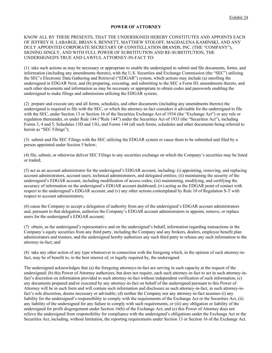 Exhibit 24 POWER OF ATTORNEY KNOW ALL BY THESE PRESENTS, THAT THE UNDERSIGNED HEREBY CONSTITUTES AND APPOINTS EACH OF JEFFREY H. LABARGE, BRIAN S. BENNETT, MATTHEW STOLOFF, MAGDALENA KAMINSKI, AND ANY DULY APPOINTED CORPORATE SECRETARY OF CONSTELLATION BRANDS, INC. (THE “COMPANY”), SIGNING SINGLY, AND WITH FULL POWER OF SUBSTITUTION AND RE-SUBSTITUTION, THE UNDERSIGNED'S TRUE AND LAWFUL ATTORNEY-IN-FACT TO: (1) take such actions as may be necessary or appropriate to enable the undersigned to submit and file documents, forms, and information (including any amendments thereto), with the U.S. Securities and Exchange Commission (the “SEC”) utilizing the SEC’s Electronic Data Gathering and Retrieval (“EDGAR”) system, which actions may include (a) enrolling the undersigned in EDGAR Next, and (b) preparing, executing, and submitting to the SEC a Form ID, amendments thereto, and such other documents and information as may be necessary or appropriate to obtain codes and passwords enabling the undersigned to make filings and submissions utilizing the EDGAR system; (2) prepare and execute any and all forms, schedules, and other documents (including any amendments thereto) the undersigned is required to file with the SEC, or which the attorney-in-fact considers it advisable for the undersigned to file with the SEC, under Section 13 or Section 16 of the Securities Exchange Act of 1934 (the “Exchange Act”) or any rule or regulation thereunder, or under Rule 144 (“Rule 144”) under the Securities Act of 1933 (the “Securities Act”), including Forms 3, 4 and 5, Schedules 13D and 13G, and Forms 144 (all such forms, schedules and other documents being referred to herein as “SEC Filings”); (3) submit and file SEC Filings with the SEC utilizing the EDGAR system or cause them to be submitted and filed by a person appointed under Section 5 below; (4) file, submit, or otherwise deliver SEC Filings to any securities exchange on which the Company’s securities may be listed or traded; (5) act as an account administrator for the undersigned’s EDGAR account, including: (i) appointing, removing, and replacing account administrators, account users, technical administrators, and delegated entities; (ii) maintaining the security of the undersigned’s EDGAR account, including modification of access codes; (iii) maintaining, modifying, and certifying the accuracy of information on the undersigned’s EDGAR account dashboard; (iv) acting as the EDGAR point of contact with respect to the undersigned’s EDGAR account; and (v) any other actions contemplated by Rule 10 of Regulation S-T with respect to account administrators; (6) cause the Company to accept a delegation of authority from any of the undersigned’s EDGAR account administrators and, pursuant to that delegation, authorize the Company’s EDGAR account administrators to appoint, remove, or replace users for the undersigned’s EDGAR account; (7) obtain, as the undersigned’s representative and on the undersigned’s behalf, information regarding transactions in the Company’s equity securities from any third party, including the Company and any brokers, dealers, employee benefit plan administrators and trustees, and the undersigned hereby authorizes any such third party to release any such information to the attorney-in-fact; and (8) take any other action of any type whatsoever in connection with the foregoing which, in the opinion of such attorney-in- fact, may be of benefit to, in the best interest of, or legally required by, the undersigned. The undersigned acknowledges that (a) the foregoing attorneys-in-fact are serving in such capacity at the request of the undersigned; (b) this Power of Attorney authorizes, but does not require, each such attorney-in-fact to act in such attorney-in- fact’s discretion on information provided to such attorney-in-fact without independent verification of such information; (c) any documents prepared and/or executed by any attorney-in-fact on behalf of the undersigned pursuant to this Power of Attorney will be in such form and will contain such information and disclosure as such attorney-in-fact, in such attorney-in- fact’s sole discretion, deems necessary or advisable; (d) neither the Company nor any attorney-in-fact assumes (i) any liability for the undersigned’s responsibility to comply with the requirements of the Exchange Act or the Securities Act, (ii) any liability of the undersigned for any failure to comply with such requirements, or (iii) any obligation or liability of the undersigned for profit disgorgement under Section 16(b) of the Exchange Act; and (e) this Power of Attorney does not relieve the undersigned from responsibility for compliance with the undersigned’s obligations under the Exchange Act or the Securities Act, including, without limitation, the reporting requirements under Section 13 or Section 16 of the Exchange Act.