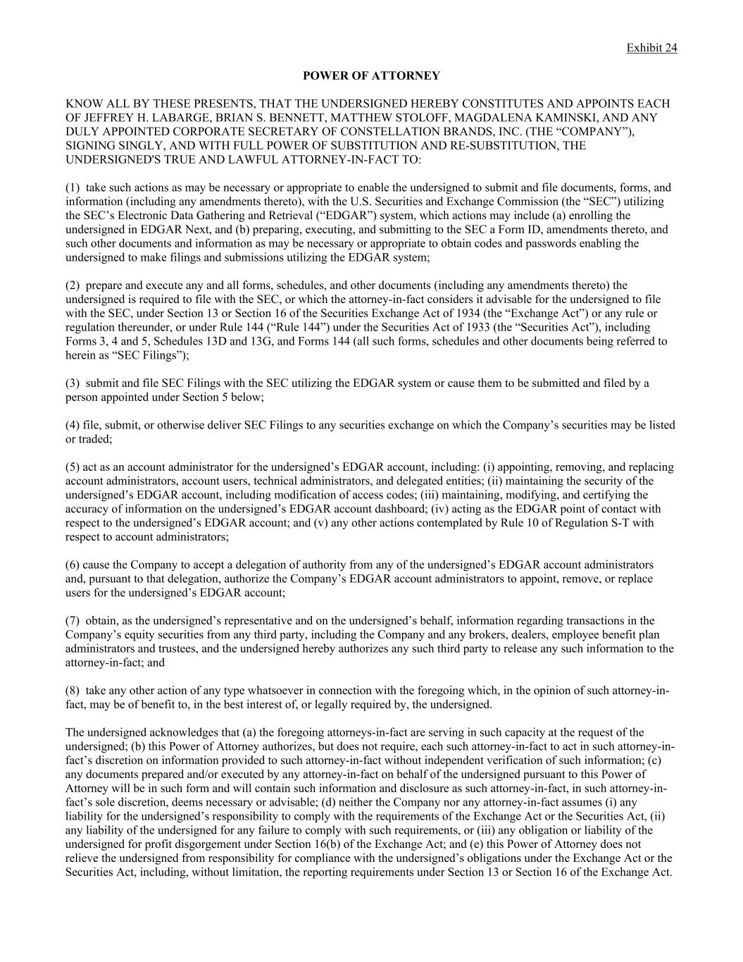 Exhibit 24 POWER OF ATTORNEY KNOW ALL BY THESE PRESENTS, THAT THE UNDERSIGNED HEREBY CONSTITUTES AND APPOINTS EACH OF JEFFREY H. LABARGE, BRIAN S. BENNETT, MATTHEW STOLOFF, MAGDALENA KAMINSKI, AND ANY DULY APPOINTED CORPORATE SECRETARY OF CONSTELLATION BRANDS, INC. (THE “COMPANY”), SIGNING SINGLY, AND WITH FULL POWER OF SUBSTITUTION AND RE-SUBSTITUTION, THE UNDERSIGNED'S TRUE AND LAWFUL ATTORNEY-IN-FACT TO: (1) take such actions as may be necessary or appropriate to enable the undersigned to submit and file documents, forms, and information (including any amendments thereto), with the U.S. Securities and Exchange Commission (the “SEC”) utilizing the SEC’s Electronic Data Gathering and Retrieval (“EDGAR”) system, which actions may include (a) enrolling the undersigned in EDGAR Next, and (b) preparing, executing, and submitting to the SEC a Form ID, amendments thereto, and such other documents and information as may be necessary or appropriate to obtain codes and passwords enabling the undersigned to make filings and submissions utilizing the EDGAR system; (2) prepare and execute any and all forms, schedules, and other documents (including any amendments thereto) the undersigned is required to file with the SEC, or which the attorney-in-fact considers it advisable for the undersigned to file with the SEC, under Section 13 or Section 16 of the Securities Exchange Act of 1934 (the “Exchange Act”) or any rule or regulation thereunder, or under Rule 144 (“Rule 144”) under the Securities Act of 1933 (the “Securities Act”), including Forms 3, 4 and 5, Schedules 13D and 13G, and Forms 144 (all such forms, schedules and other documents being referred to herein as “SEC Filings”); (3) submit and file SEC Filings with the SEC utilizing the EDGAR system or cause them to be submitted and filed by a person appointed under Section 5 below; (4) file, submit, or otherwise deliver SEC Filings to any securities exchange on which the Company’s securities may be listed or traded; (5) act as an account administrator for the undersigned’s EDGAR account, including: (i) appointing, removing, and replacing account administrators, account users, technical administrators, and delegated entities; (ii) maintaining the security of the undersigned’s EDGAR account, including modification of access codes; (iii) maintaining, modifying, and certifying the accuracy of information on the undersigned’s EDGAR account dashboard; (iv) acting as the EDGAR point of contact with respect to the undersigned’s EDGAR account; and (v) any other actions contemplated by Rule 10 of Regulation S-T with respect to account administrators; (6) cause the Company to accept a delegation of authority from any of the undersigned’s EDGAR account administrators and, pursuant to that delegation, authorize the Company’s EDGAR account administrators to appoint, remove, or replace users for the undersigned’s EDGAR account; (7) obtain, as the undersigned’s representative and on the undersigned’s behalf, information regarding transactions in the Company’s equity securities from any third party, including the Company and any brokers, dealers, employee benefit plan administrators and trustees, and the undersigned hereby authorizes any such third party to release any such information to the attorney-in-fact; and (8) take any other action of any type whatsoever in connection with the foregoing which, in the opinion of such attorney-in- fact, may be of benefit to, in the best interest of, or legally required by, the undersigned. The undersigned acknowledges that (a) the foregoing attorneys-in-fact are serving in such capacity at the request of the undersigned; (b) this Power of Attorney authorizes, but does not require, each such attorney-in-fact to act in such attorney-in- fact’s discretion on information provided to such attorney-in-fact without independent verification of such information; (c) any documents prepared and/or executed by any attorney-in-fact on behalf of the undersigned pursuant to this Power of Attorney will be in such form and will contain such information and disclosure as such attorney-in-fact, in such attorney-in- fact’s sole discretion, deems necessary or advisable; (d) neither the Company nor any attorney-in-fact assumes (i) any liability for the undersigned’s responsibility to comply with the requirements of the Exchange Act or the Securities Act, (ii) any liability of the undersigned for any failure to comply with such requirements, or (iii) any obligation or liability of the undersigned for profit disgorgement under Section 16(b) of the Exchange Act; and (e) this Power of Attorney does not relieve the undersigned from responsibility for compliance with the undersigned’s obligations under the Exchange Act or the Securities Act, including, without limitation, the reporting requirements under Section 13 or Section 16 of the Exchange Act.